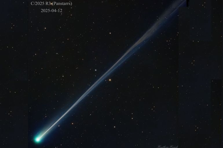في مشهد يأسر الأبصار ويستدعي التأمل، التقط المصور الفلكي هيثم حمدي، عضو الجمعية الفلكية الأردنية والمقيم في الولايات المتحدة، صورة مذهلة للمذنب "بان ستارز" (C/2025 R3 PanSTARRS)، تظهر ذيله الطويل والخافت وهو يمتد عبر الفضاء كخيط ضوئي منسوج بعناية في ظلمة الكون.