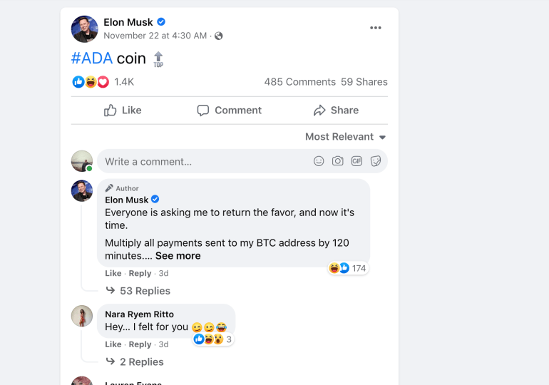 خدعوا نظام فيسبوك للتحقق.. محتالو البتكوين يستخدمون اسم إيلون ماسك لجمع الأموال